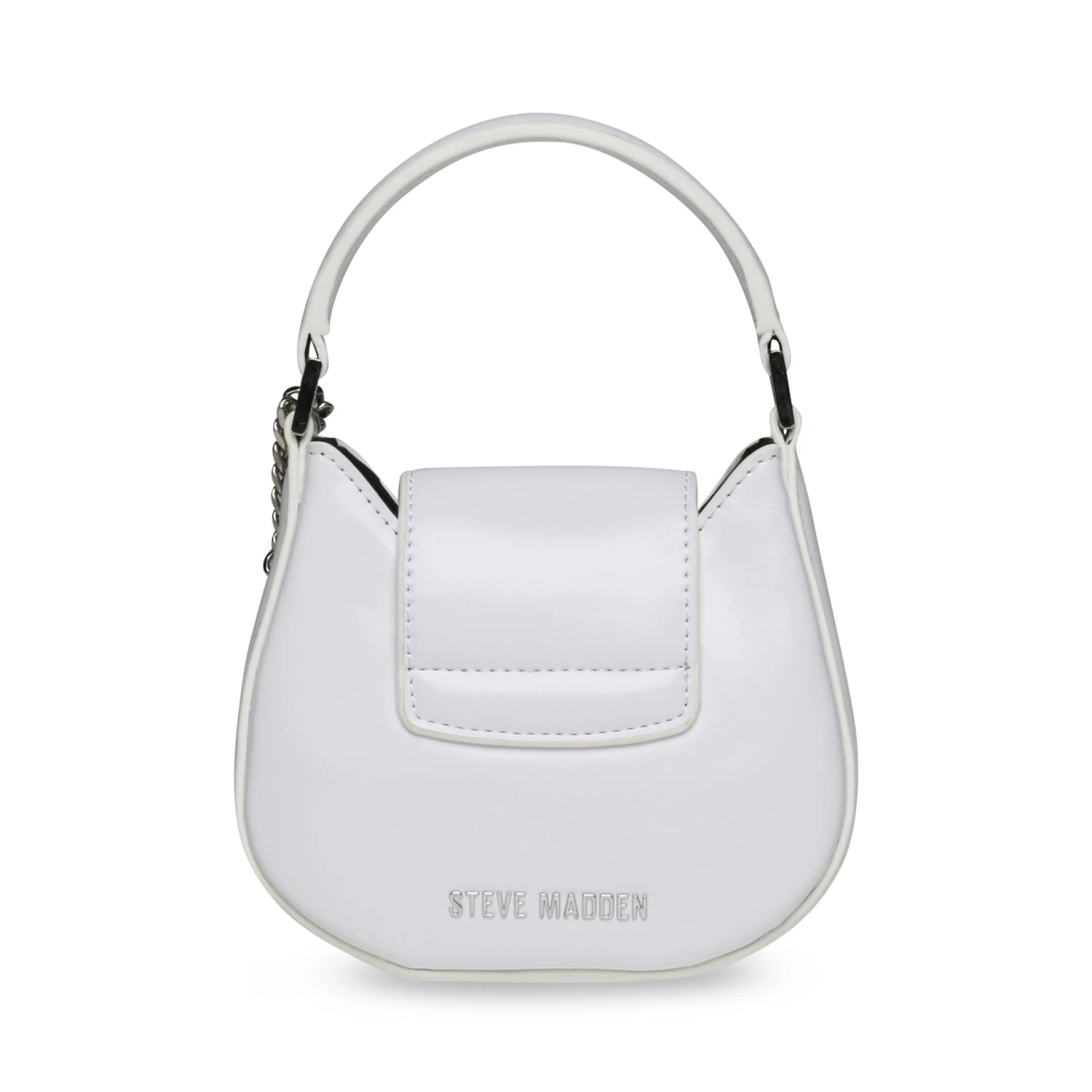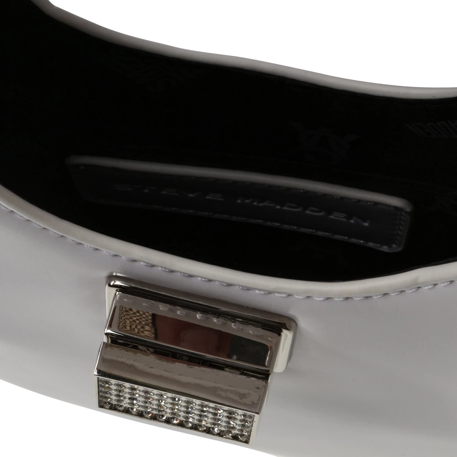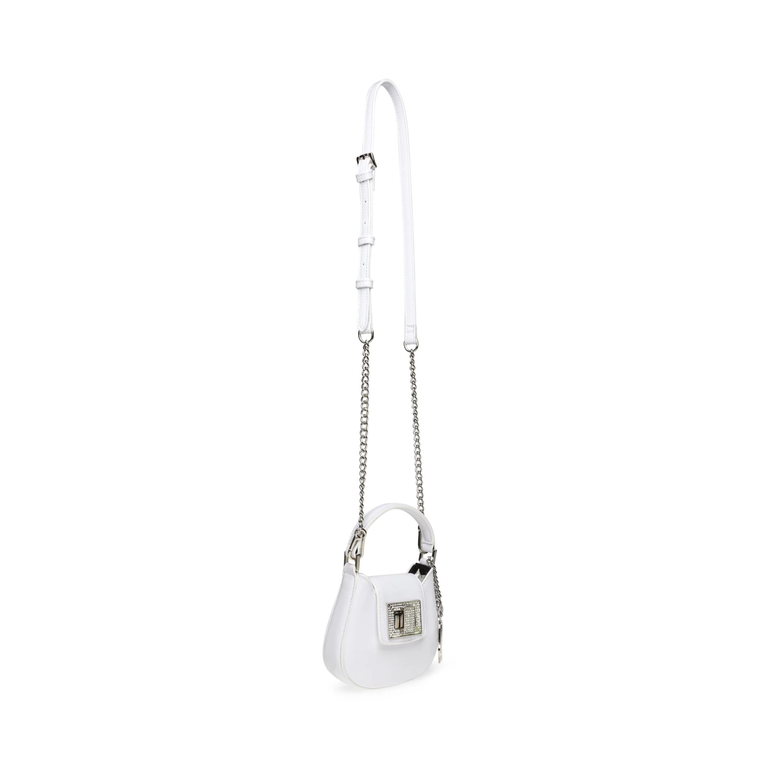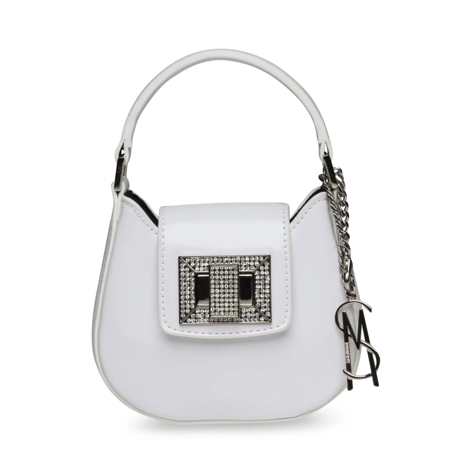 The BGLANCE bag elevates its mini saddlebag silhouette with a matching top handle and rhinestone embellished hardware.