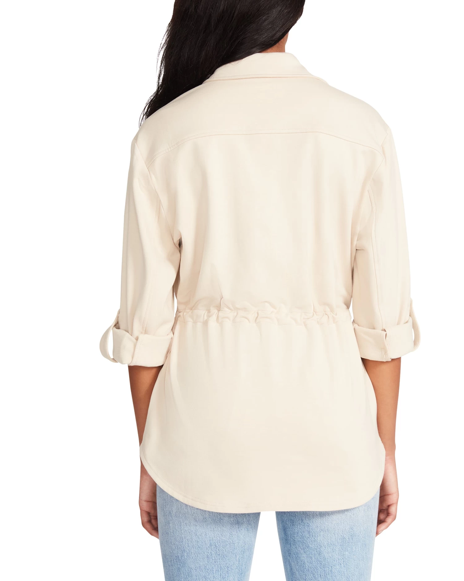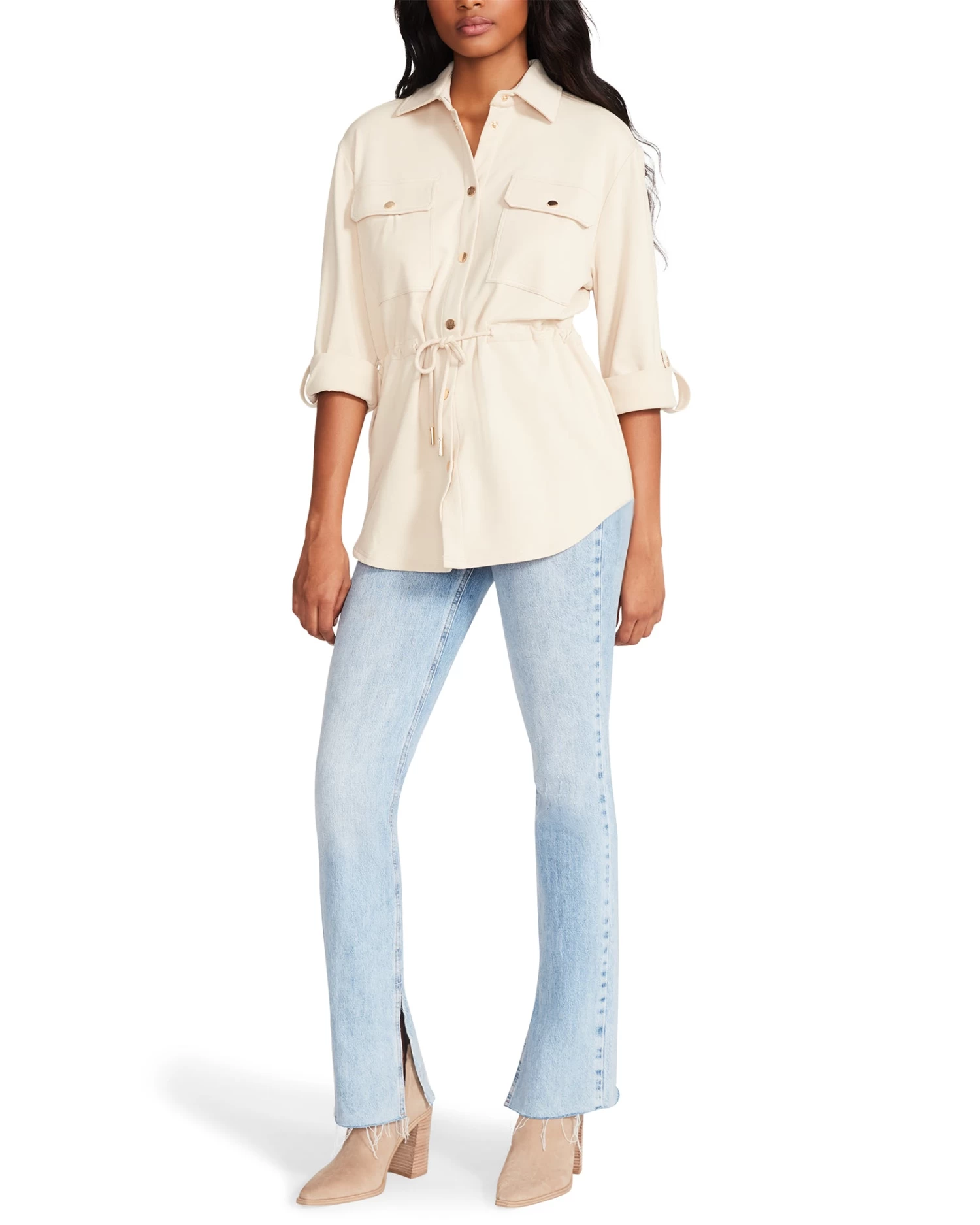 - Button-front closure, elbow-length sleeves