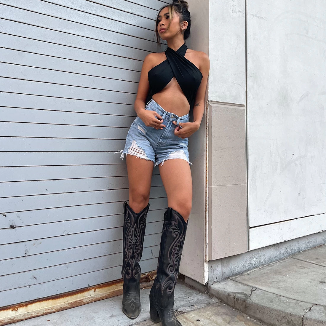 A Western boot is a requirement for any wardrobe and we’re obsessed with LASSO. This knee-high pair features whip-stitching detail and a towering block heel.