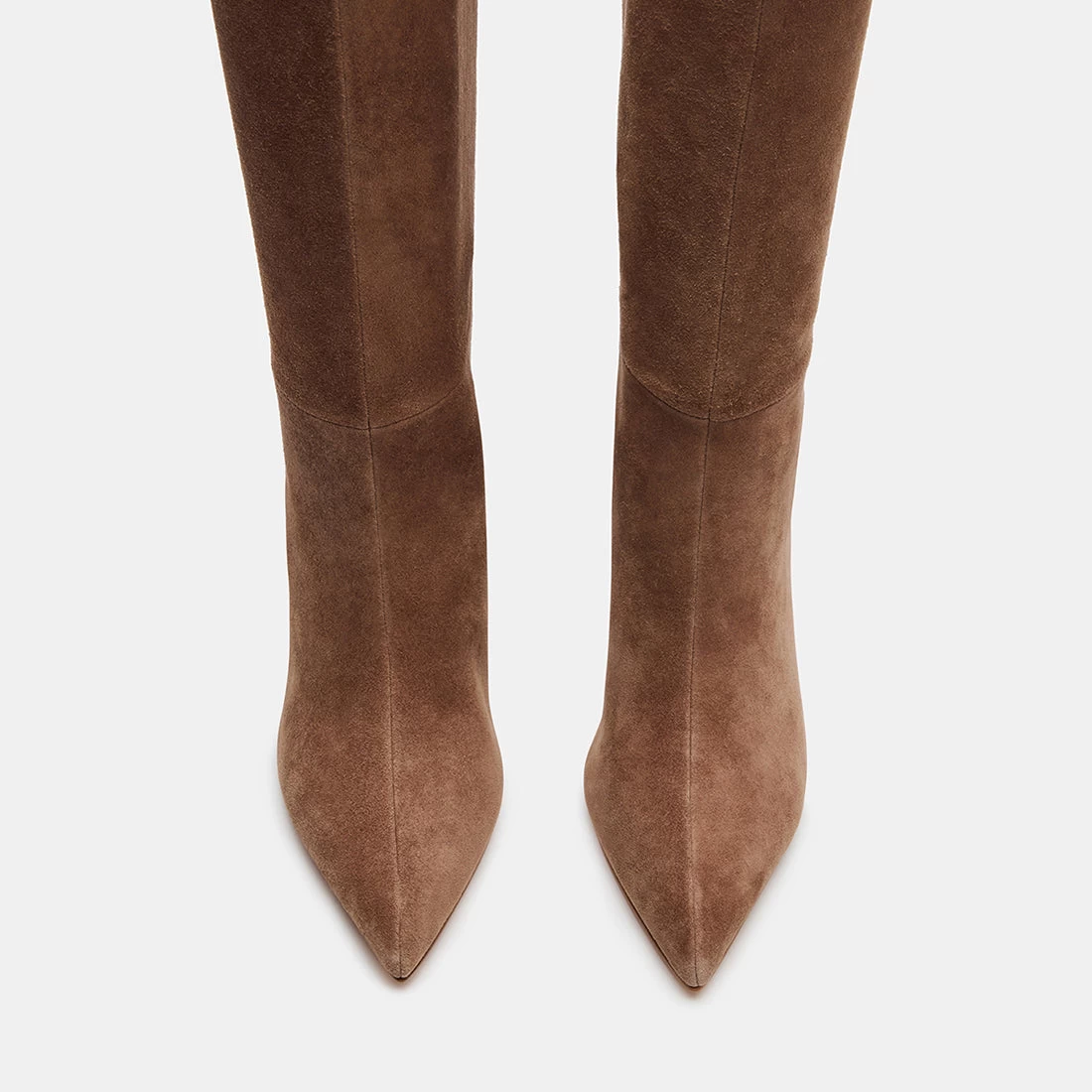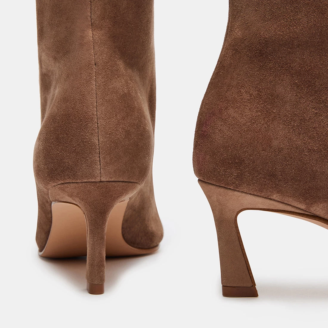 The LAVAN boot features a wider shaft to allow for a no-closure pull-on design set on a pointed toe and an architectural angled kitten heel.