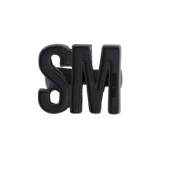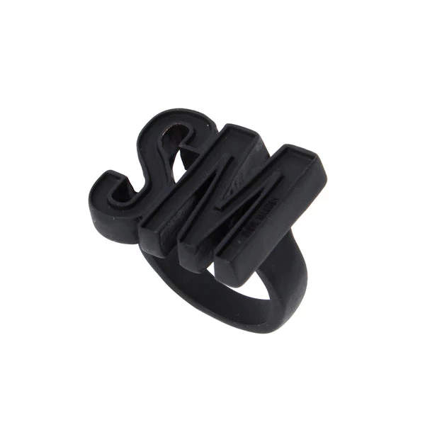 Sleek band ring adorned with signature SM logo in black. This statement ring is size 7, set in matte black-plated metal.
