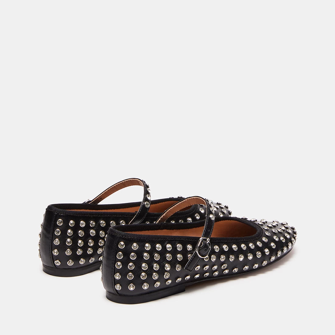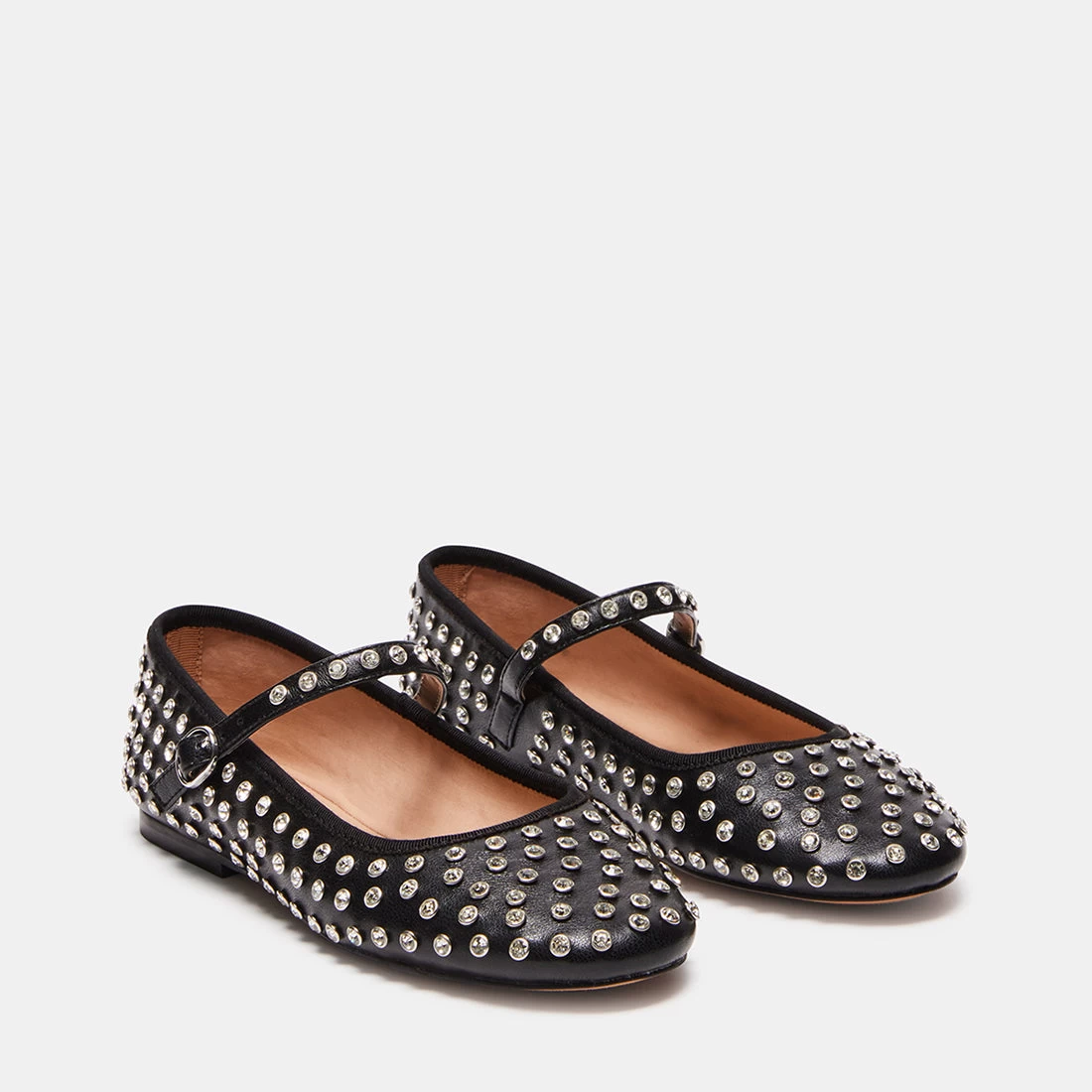 VINETTA RHINESTONES is a relaxed Mary Jane design with a flat sole and a slim buckle strap across the top. Rhinestone studs set over the upper and along the strap and texture – and lots of sparkle – to the look.